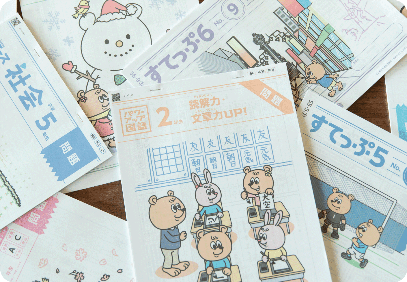 - 小学生向けオプション教材『パワーアップ国語』『パワーアップ算数』『理科』『社会』、無学年式教材『くまトレ』などで学力に応じて対応できる