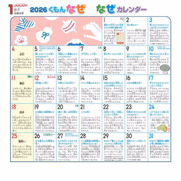「くもんなぜなぜカレンダー」は、365日、1日1問のクイズが掲載されたカレンダーです。毎年、通常サイズと大判サイズが発売されています。もともと公文式教室で学ぶ子どもたちに向けて制作されたものですが、その後、一般にも販売するようになり、教室に通っていない方でも購入が可能になりました。