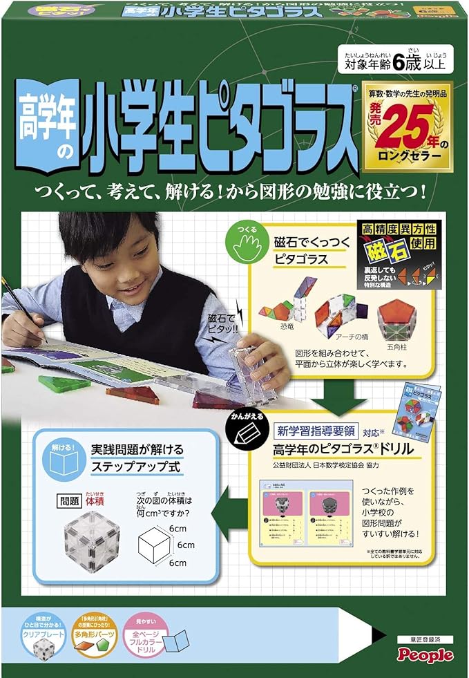 我が家では保育園で遊んだのをきっかけに、図形の勉強に役立ちそうだったので年小さんの時に購入しました。「きほんボックス」から始まり、図形に興味をもち、「小学生ピタゴラス」も購入しました。ピタゴラスにハマった時期は、超大作にチャレンジしていたのが良い思い出です。その後、小学生になってからは、図形の学習の時に、このプレートを使って一緒に勉強しました。ピタゴラスで遊んでいたおかげで図形の導入はもちろん、立体問題なども頭の中で理解しやすかったそうなので、本当に使って良かったな、と思います。